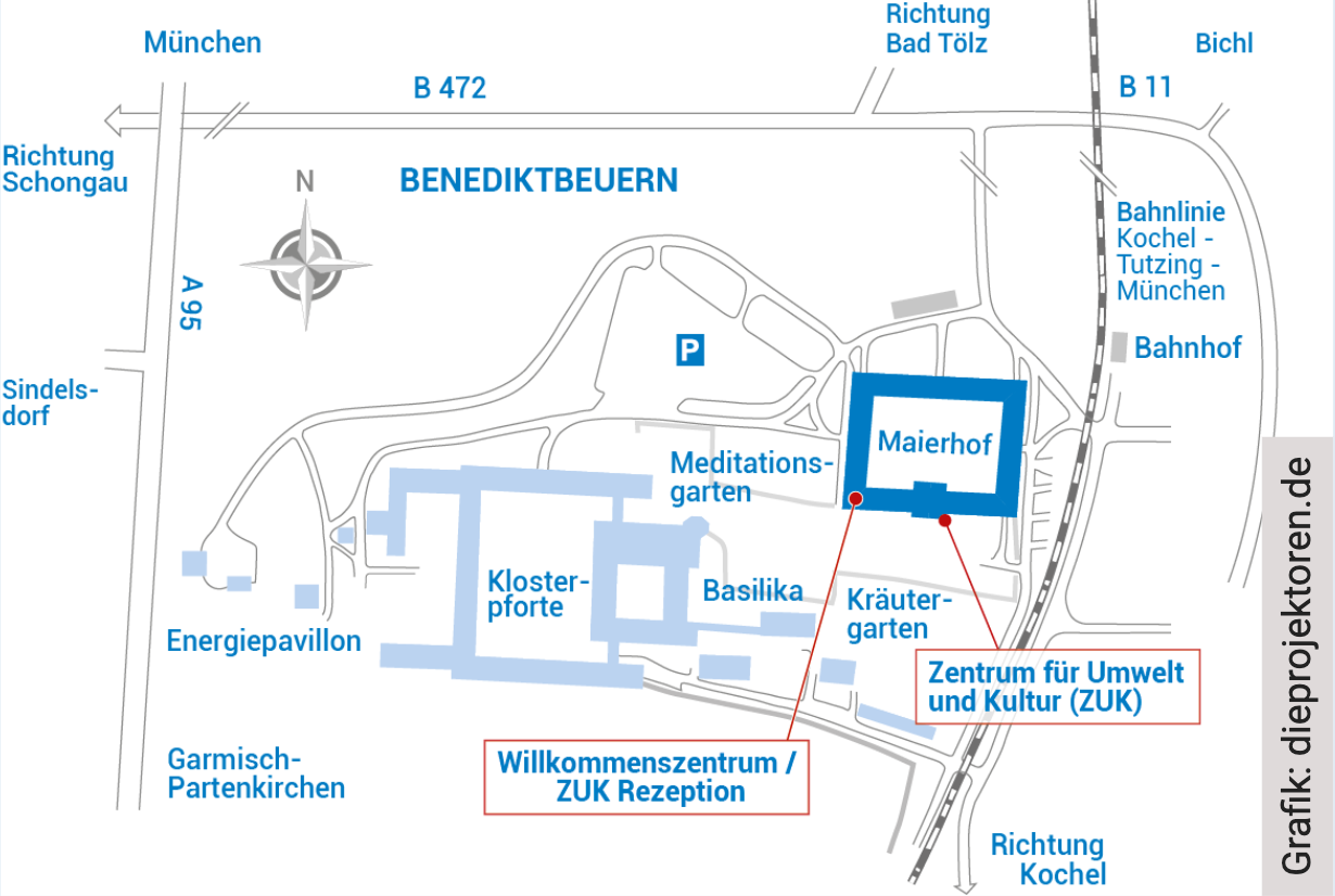 Hier findest du den Lageplan des Klosters Benediktbeuern und des ZUK damit du dich vor Ort zurechtfindest. Schlüsselübergabe für Übernachtungsgäste ist im Willkommenszentrum des Maierhofs.